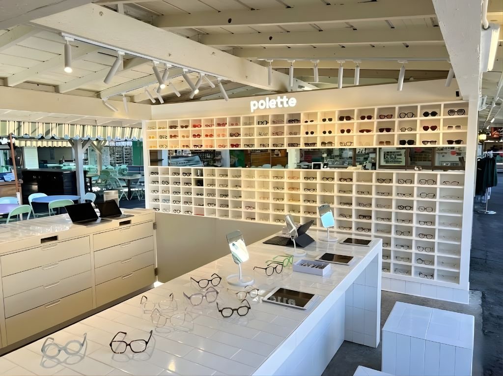 - De Kleurenwand: Meer dan 200 kleurrijke monturen worden gepresenteerd tegen een achtergrond met ingebouwde spiegels, wat een heldere en uitnodigende ruimte creëert die de levendige geest van zowel polette als de Farmers Market weerspiegelt.